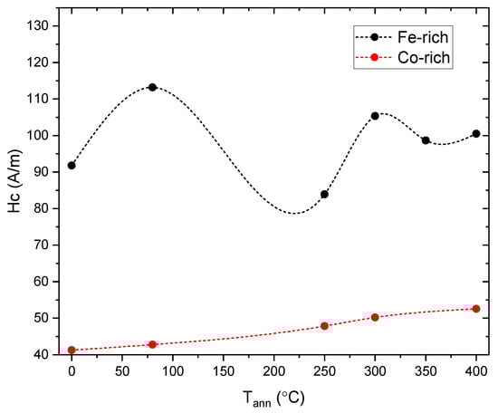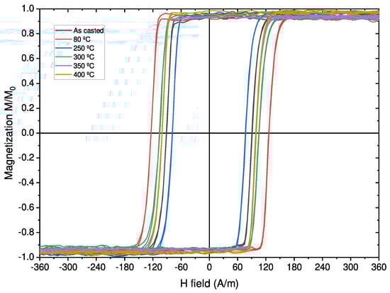 The evolution of the coercive field in the Fe-rich microwire (Figure 4) presents irregular behavior, obtaining a maximum of A/m after 80 °C annealing and a minimum of A/m at 250 °C. This increases again at 300 °C to A/m and stabilizes at 350 °C and 400 °C at A/m. These changes in the hysteresis loops must be related to the reordering of internal stresses due to the internal stress redistribution and the change in the local atomic environment during the annealing procedures. These reorganizations and relaxations must be quite complex, as there is not an obvious relation between the abrupt changes in the coercive field evolution and annealing temperature.