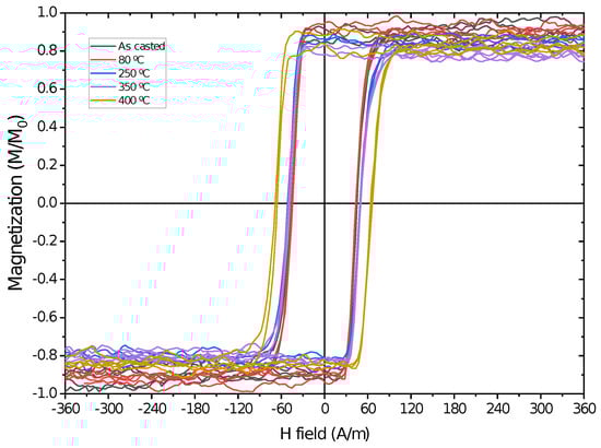 The loops presented in Figure 5 show low coercive fields, with A/m in all the analyzed samples. Without applied stress, the coercive field remains stable up to 350 °C, while at 400 °C annealing, it increases from A/m to A/m. This behavior points to stress relaxation due to the annealing process being capable of inducing magnetic hardening of the microwire.