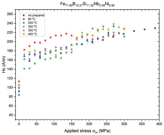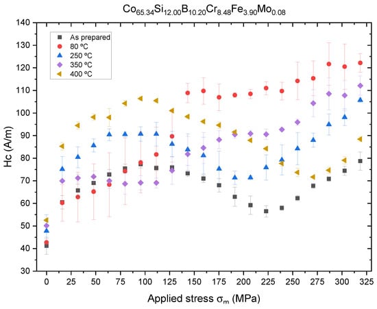 Coercive field response to applied stress for the microwires after 60 min of temperature annealing.