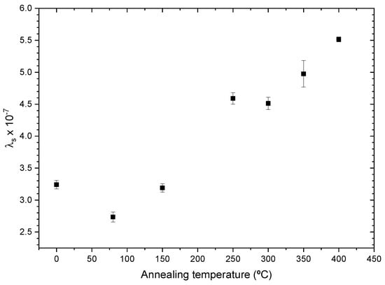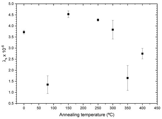 In Figure 9, we can observe the evolution of the magnetostriction coefficient with the annealing temperature for the Fe-rich alloy. All samples present high values in the order of , which explains the similar evolution for all samples of with the applied stress observed in Figure 7. It is worth noting that the obtained values are lower than the values reported for Finemet-type amorphous ribbons [24]. Such differences can be related to either slightly different chemical compositions or the influence of internal stresses induced by the glass coating. A sharp reduction in is observed from to at 80 °C, which correlates with an increase in the value and sensibility related to the vs. curve. This increase in sensibility could be exploited for the fabrication of sensors with an increased sensibility, as the curve maintains the same shape as reported in our previous work [8] and could be interpolated in the same way up to MPa. At °C, the magnetostriction coefficient presents a maximum, , and then starts to decrease to values lower than the as-prepared sample.