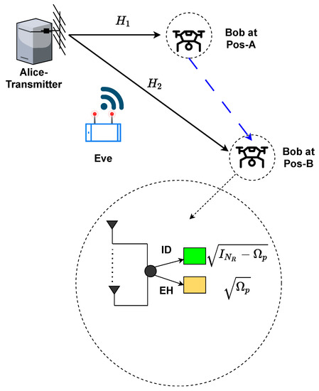 where ∈∼ is an additive complex Gaussian noise received at the ID portion of Bob at Pos-A. Let denote the power-splitting ratio for the i-th receiver antenna, defining as diag, 0 ≤ ≤ 1, where i varies from 1 to . The received signal at the eavesdropper side is given by