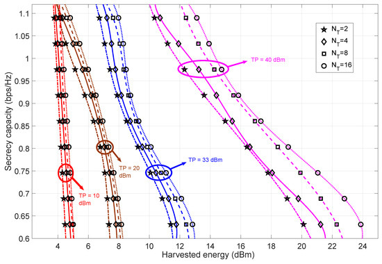 The achievable harvested energy values and corresponding range are small for the lower transmit power regimes due to the directly proportional relationship between the transmit power matrix, harvested energy and the transmit power constraint C1 in (7). However, the harvested energy range becomes wider as the transmit power value increases. This increase in range is due to the inherent properties of the transmit power matrix Q. Increasing the number of transmit antennas at Alice increases the matrix dimension of Q, which further amplifies the harvested energy (which can be verified from the harvested energy expression in (31)). Hence, we can infer that the increase in the number of transmit antennas is the least noticeable (due to the narrow range of harvested energy values) when the transmit power is low. Comparing within the higher transmit power regime, the increase in the harvested energy decreases the secrecy capacity (for all the combinations of transmit antennas at Alice). Overall, the trend of the secrecy capacity is steep. This is due to the more stringent constraint imposed by the formulated problem.