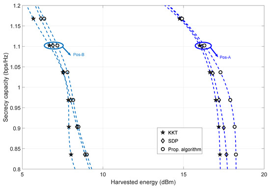 The trade-off between secrecy capacity and harvested energy for fixed value of transmit antennas (taken as 8) at Alice for Pos-A and Pos-B, analyzed for different algorithms—SDP [30] and KKT [36]. Here, transmit power is fixed at 33 dBm.