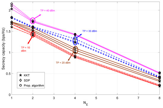 Figure 5 shows the secrecy capacity for different numbers of eavesdropper antennas. As the number of eavesdropper antennas increases, the secrecy capacity value decreases. This is because the information capacity value of the eavesdropper increases as the number of eavesdropper antennas increases (thus decreasing the secrecy capacity value). However, when the number of eavesdropper antennas is eight, the secrecy capacity barely exceeds the secrecy capacity of 0.5 bps/Hz. This means that simultaneously increasing the number of eavesdropper antennas and decreasing the transmit power has a negative effect on the secrecy capacity values. However, the increase in transmit power has a positive effect on the secrecy capacity values, resulting in an overall increase in the secrecy capacity (seen throughout the regime). The secrecy capacity difference for all the algorithms is almost the same for higher transmit power values. However, for lower values of transmit power, the differences in performance based on secrecy capacity can be observed. For all the simulated configurations of , the proposed algorithm can achieve higher values of secrecy capacity, with a maximum difference in performance observed when = 4 and the transmit power is at 8 dBm.