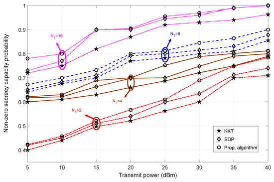 Analysis of non-zero secrecy capacity probability versus transmit power for varying transmit antennas at Alice when Bob is at Pos-A for different algorithms—SDP [30] and KKT [36].