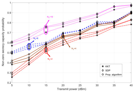 Comparing different algorithms, our proposed algorithm maintains a higher probability value for the entire transmit power regime. However, for the higher transmit power regime, the probability of achieving positive secrecy capacity is almost the same for = 16. Overall, we can conclude that under a high transmit power regime, our proposed algorithm has a high probability of generating positive secrecy capacity values compared to other algorithms.