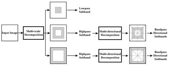 As depicted in Figure 2, NSST decomposes the source image into a series of high- and low-frequency sub-images. It can be divided into two major steps: (1) Multi-scale decomposition can obtain subbands by using the non-subsampled (NS) pyramid filter. (2) Shearlet transform (ST) is employed to obtain multi-directional decomposition. The ST is close to the optimal sparse representation. The synthetic expansion of the affine system is described as follows: