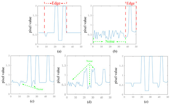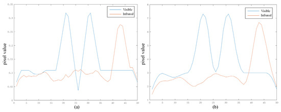 After processing the infrared and visible detail layers described above, we obtain corresponding images with enhanced edges and textures. In Figure 5, to visually demonstrate the effects of bilateral transpose correlation and smoothing, we provide an example using the one-dimensional signal from Figure 3. From Figure 5, it is evident that the bilateral transpose correlation amplifies the differences in the edges of the image. However, a little noise in the infrared image is still greater than the edges in the visible image. Then, smoothing raises all edges above the noise values, ensuring that the edges in the fusion result are continuous and intact.