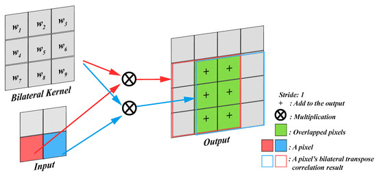 Firstly, the schematic diagram of the transpose correlation is shown in Figure 4. The larger absolute values in the detail layers correspond to sharper brightness changes and thus to the salient features in the image, such as edges, lines, and region boundaries. It can be observed that the overlapping regions during the kernel movement add up. When the pixels represented by red and blue belong to the edge, the accumulation will further enhance the edge. When both of these pixels do not belong to the edge, the accumulated value is relatively smaller. The size of the output image for transposed correlation can be calculated using Equation (1).