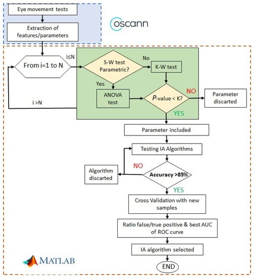 Figure 2 shows the procedure to find alterations of ocular movements in cirrhotic patients. The first step is to record ocular movements according to medical protocol; then, OSCANN’s software provides a wide list of features that should be carefully analyzed. The reader is referred to [] for a full description of the internal process in OSCANN’s software. In order to obtain those typical alterations of eye movement in cirrhotic patients, we performed two different analyses in the Matlab environment (see Figure 2). Initially, we separated variables into parametric and non-parametric using the Shapiro–Wilk test (S-W). If the feature is parametric, p-value is computed through the ANOVA test and through Kruskal–Wallis in the other case.