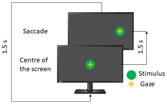 The gaze tracker used to measure eye movement is based on the VOG technique to record eye movement []. An infrared camera at 100 FPS is used to capture the movement of the dominant eye. A conventional chin rest is used to prevent head movements; then, a pure eye movement is measured. The chin rest is placed at 60 cm from the screen used to deploy visual stimulus. This is a typical setup in video-oculography systems [,,,,]. The hardware consists of three key elements: