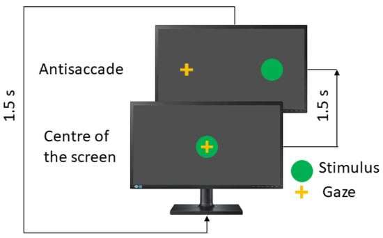 In the antisaccades test (AST), the patient is asked to look in the opposite direction to the stimulus, such as a mirror. Here, the instruction to the patient is to look to the opposite side of the green dot. Figure 4 shows the concept.