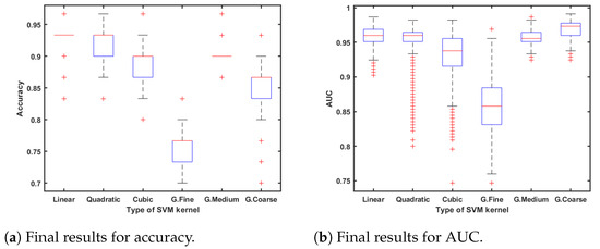After computing the p-value of each feature, we analyzed the accuracy of a group of machine learning algorithms. If it was higher than , we checked the ROC curve, more specifically, the area under the curve (AUC). That area represents a ratio between the true and false values. Finally, we selected the best AUC value and, consequently, the algorithm used to obtain it.
