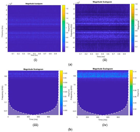 In this study, both the Sobel and wavelet denoising filters were applied to images generated through CWT and STFT. These filters enhance the quality and clarity of the images by emphasizing edges and reducing noise. The Sobel filter enhances the edges of both scalograms, allowing better detection and visualization of correlated regions [31]. On the other hand, the wavelet denoising filter helps remove noise from both CWT and STFT scalograms, resulting in a cleaner representation of the signal’s time–frequency characteristics. This study aimed to enhance the precision and comprehensibility of the analysis findings by implementing these filters. The following figures illustrate the comparison of these filters. Figure 2a depicts the STFT comparison while using Sobel and wavelet denoising filters. Figure 2b shows the comparison between Sobel and wavelet denoising with and without filtered scalograms.