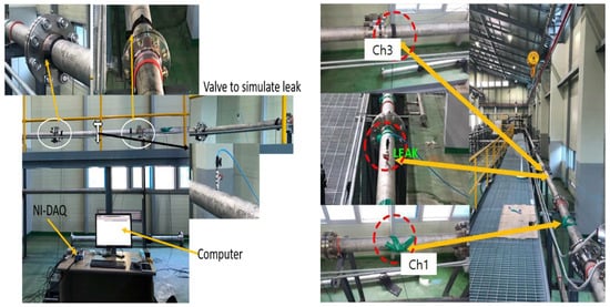 The experimental setup employed in this study is illustrated in Figure 3 and Figure 4, along with the corresponding schematics. To simulate pipeline leaks, a stainless-steel water pipeline measuring 114.4 mm in outer diameter and 6 mm in thickness was fitted with AE R15I-AST sensors provided by Mistras Group, Inc (New Jersey, NJ, USA), to capture AE signals. The signals were recorded at a sampling frequency of 1 MHz using a National Instruments (Austin, TX, USA) data-collection apparatus (model NI-9223) connected to a computer. To replicate leaks of varying sizes, a hole was created in the pipeline using an electric drill. A fluid control valve was welded at the precise location of the hole to regulate fluid flow. For the experiment, water was chosen as the fluid owing to its non-toxic and non-hazardous properties. This selection allowed us to simulate controlled and secure leak scenarios.