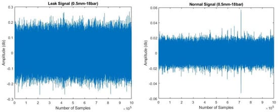 The leak simulation was executed through incorporation of a valve into the pipeline, followed by tests conducted under varying pressure conditions of 13 and 18 bar. The procedural steps commenced with the initial closure of the valve, during which data collection occurred for 2 min while the pipeline operated normally. Subsequently, the valve was opened to introduce a leak of 1 mm, and data collection was extended for an additional 4 min. Closure of the valve marked stabilization of the pipeline flow. This entire sequence was replicated for both pressure levels, maintaining the same size of the leak pinhole. In total, 360 signal samples were gathered for each test, with 120 samples stemming from the normal operational state and 240 samples arising from the leak condition. These samples were then utilized for subsequent analysis. Figure 5 and Figure 6 depict the AE signals obtained during the leak and normal operation of the pipeline, respectively. To ensure the safety of personnel, the fluid leaking from the pipeline was collected in a container using a hose.