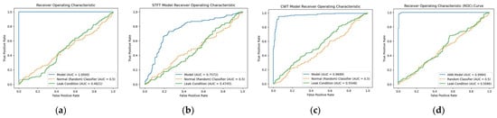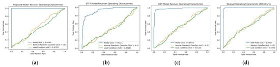 ROC curve comparison: (a) proposed model vs. (b) STFT-CNN, (c) CWT-CNN, and (d) Prosvirin et al. models (leak size = 0.3 mm).