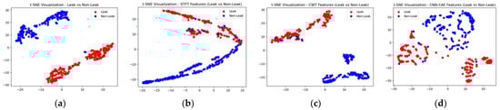 T-SNE visualization: comparative analysis of the (a) proposed model with (b) STFT-CNN, (c) CWT-CNN, and (d) Prosvirin et al. models (leak size = 0.5 mm).
