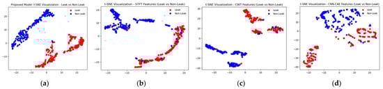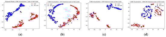 T-SNE visualization: comparative analysis of the (a) proposed model with (b) STFT-CNN, (c) CWT-CNN, and (d) Prosvirin et al. models (leak size = 0.3 mm).