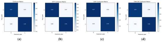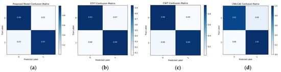 Confusion matrix comparison: (a) proposed model vs. (b) STFT-CNN, (c) CWT-CNN, and (d) Prosvirin et al. models (leak size = 0.5 mm).