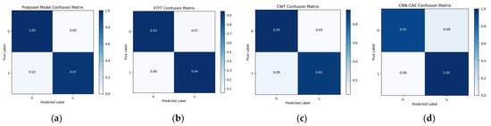 Confusion matrix comparison: (a) proposed model vs. (b) STFT-CNN, (c) CWT-CNN, and (d) Prosvirin et al. models (leak size = 1.0 mm).