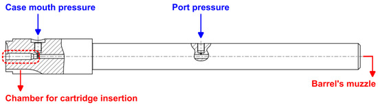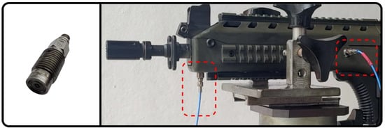 In ammunition tests in which the internal pressure is measured, one or two piezoelectric transducers can be installed, with the positions defined by each certifying organization. For EPVAT tests (Electronic Pressure Velocity and Action Time), the North Atlantic Treaty Organization (NATO) determines that a transducer is installed in the test barrel in a position equivalent to the mouth of the ammunition case for tests of all calibers, aiming to measure the “case mouth pressure”, and in the case of calibers of 5.56 × 45 mm and 7.62 × 51 mm, a transducer should also be installed close to the intermediate region of the test barrel for the measurement of “port pressure” [11].