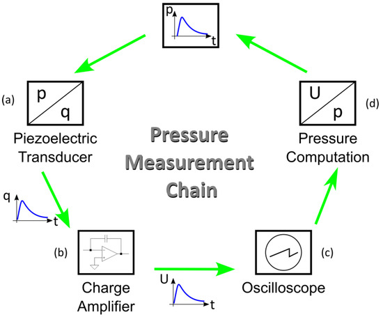 To obtain accurate and reliable readings from piezoelectric transducers, it is necessary to use charge amplifiers in the instrumentation to convert the electric charge originating from the direct piezoelectric effect into a proportional electric voltage. Thus, from the dynamic pressure pulse, the piezoelectric transducer produces an electric charge that, in turn, is converted into a voltage by the charge amplifier. Finally, the voltage measurement can be performed using an oscilloscope, for example, so that it is converted into pressure, knowing the charge amplifier amplification factor and the sensitivity of the piezoelectric transducer, completing the pressure measurement chain, summarized in Figure 3.