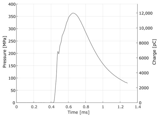 In order to generate input data for the first simulation, that is, the pressure-time curve, the PRODAS interior ballistics module was used. In this example, the parameters of the 7.62 × 51 mm NATO Ball ammunition were adopted, with data from a 7.62 × 51 mm EPVAT test barrel. Figure 19 shows the theoretical breech pressure curve over time for the 7.62 × 51 mm NATO Ball caliber simulation, as well as the calculated electrical charge for a transducer with a nominal sensitivity of .