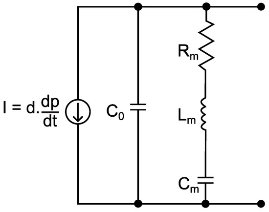 For the modeling of the HPI GP6 piezoelectric transducer, the model called Butterworth–Van Dyke (BVD) was considered, as recommended by the IEEE Standard on Piezoelectricity (ANSI/IEEE Std 176-1987) [19]. The BVD model is useful for the analysis of the electrical performance of piezoelectric transducers [20] and can be used in the design and optimization of piezoelectric devices [21,22,23,24]. The BVD model circuit consists of a resistor, an inductor and a capacitor in series (, , ), all connected in parallel with a second capacitor (), as shown in Figure 5.