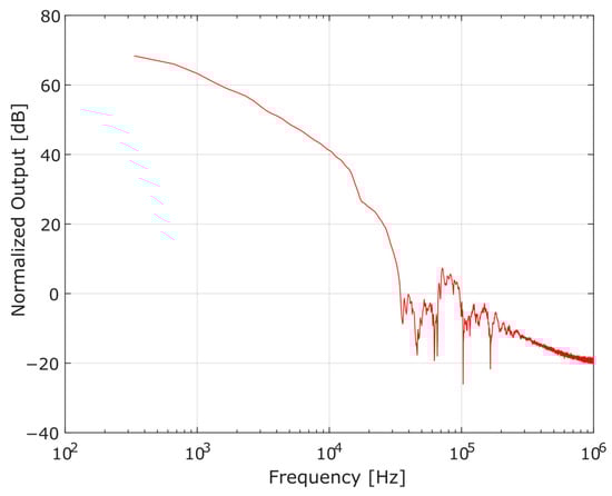 From the impedance equation of the BVD model (2), its elements can be determined employing the least squares curve fitting of the impedance obtained experimentally, unlike other approaches, in which the determination of the elements of the electric circuit takes place by means of parametric equations dependent on the magnitude of the impedance at specific frequencies [22,24,25], or even by employing physical parameters that are characteristic of the piezoelectric material of the transducer [26]. For this, we used a Keysight E4900A impedance analyzer, which basically excites the transducer through a voltage of with a variable frequency and measures its response, providing the reactance and resistance for a frequency range from to . Calculated by Fast Fourier Transform (FFT), the frequency domain representation of the pressure-time signal of Figure 4 is shown in Figure 6, showing that the useful signal is lower than . So, it is acceptable to use the referred frequency range (–) for the impedance fit.