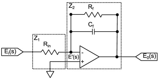 Advancing in the modeling of the dynamic pressure measurement chain, in the case of the charge amplifier, the simplified topology presented in Figure 8 [28,29,30,31] was adopted to compose the modeling as a whole.