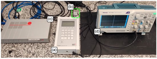 Instruments series connection: (a) function generator HPI B202; (b) reference capacitor; (c) charge amplifier HPI B217; and (d) oscilloscope.