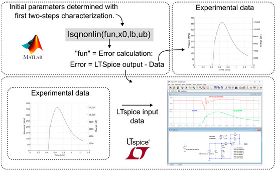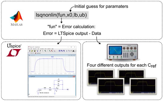 From the different responses obtained in the characterization, similar to the piezoelectric transducer modeling, a MATLAB curve-fitting tool was used. This time, the function used was “lsqnonlin”, which also fits the parameters vector to a nonlinear function. In this case, the MATLAB function fits the data measured by the oscilloscope to the data simulated by a circuit model implemented in LTSpice (version 17.0.36.0), that is, the corresponding parameters (the values of the components in Figure 8) were inserted into LTspice, and the simulated result was compared to the input data obtained with the oscilloscope, thus determining the error. Figure 11 illustrates the routine developed for the charge amplifier characterization.