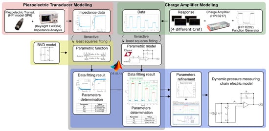 Finally, the three-step modeling is completed, starting with the piezoelectric transducer and the charge amplifier modeling, and ending with parameters refinement. Figure 13 illustrates the entire modeling process, culminating in the electrical model of the dynamic pressure measurement chain.