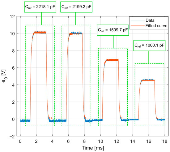 By means of the procedure described in Section 3.2, using the curve-fitting procedure to obtain the charge amplifier circuit response from the known input, it is possible to determine the desired parameters of the HPI B217 charge amplifier electric model. Figure 15 shows the curve-fitting result, considering the four outputs for each reference capacitor.