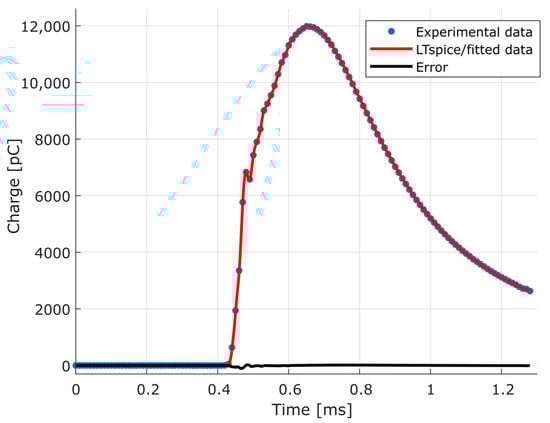 After modeling each element of the dynamic pressure measurement chain, the refinement of the parameters described in Section 3.3 was carried out. Using the experimental data illustrated in Figure 4, the electrical model was fitted, obtaining the response through simulation in LTspice, as shown in Figure 16. For the obtained data fitting, the determination coefficient was 0.9999.