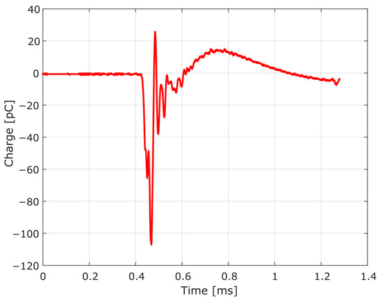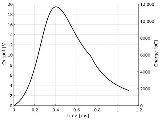 The obtained parameters are presented in Table 4. For the curve fit, the determination coefficient was , and the charge amplifier time constant was calculated as . The amplification factor of the HPI B217 charge amplifier was , defined by the relationship between the maximum response voltage and the input charge.