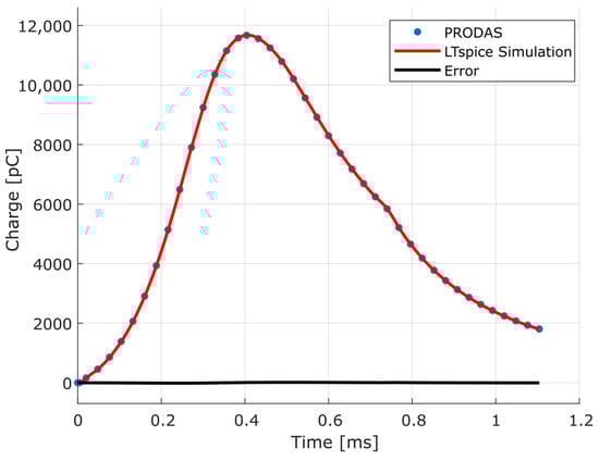 Charge-time curve of PRODAS simulation and LTspice circuit model simulation, and calculated error between them.