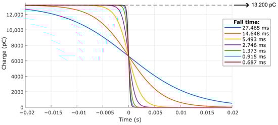 For the calibration of piezoelectric transducers, the duration of the dynamic event is directly linked to the characteristics of the charge amplifier, as already mentioned in Section 3.2. Thus, there is relevance in simulating step inputs with varying fall times (defined between the levels of 90% and 10% of the maximum charge) in order to determine the limit for the correct measurement of the pressure/electric charge, without attenuation of the response caused by the measurement chain. Thus, by varying the constant , it is possible to create different dynamic events with their respective fall times, as shown in Table 2.