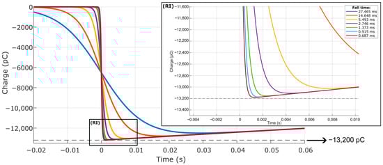 After differentiating the negative step signals with respect to time, an operation necessary for the use of the different input signals in the current source of the electrical model, the seven calibration simulations were performed, resulting in the responses illustrated in Figure 23, which highlights the Region of Interest (RI), in which the different responses reach their respective minimum values of electric charge. Since the pressure step produces a negative pressure variation, the response signal has negative values. Therefore, the maximum expected charge is −13,200 pC.