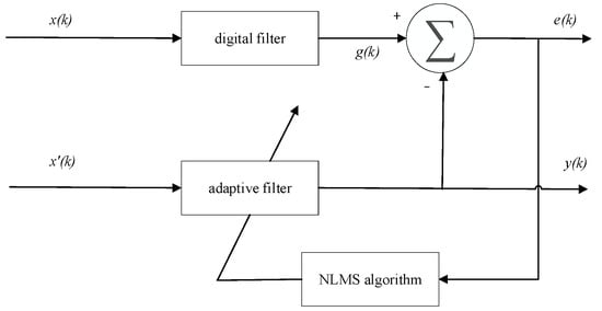 The LMS adaptive filter is capable of extracting useful signals from strong background noise. The NLMS algorithm, an extension of the LMS algorithm, is widely used in adaptive filtering [,]. NLMS is a variable step-size adaptive filtering algorithm that improves the convergence speed and accuracy compared to the fixed step-size of LMS. Its principle is shown in Figure 1 as follows: