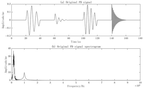 The clean PD signal and its corresponding frequency spectrum can be plotted based on the four PD signal models and their parameters in the table, as shown in Figure 4.