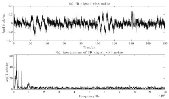 The amplitude of the narrowband interference is set to 0.02, and the frequencies fi are, respectively, set as: 0.03 MHz, 0.1 MHz, 0.2 MHz, 0.3 MHz, and 0.5 MHz. The PD signal with two types of noise added and its frequency spectrum is shown in Figure 5. The amplitude of the PD signal has changed after the addition of noise, and the noise is distributed throughout the waveform.