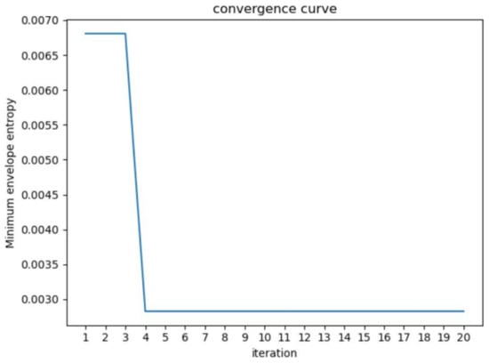 The reasonable selection of parameters K and α is essential for the precise decomposition of PD signals using VMD. The WOA algorithm parameters are set with a population size of 100, a search dimension of 2, and a maximum iteration count of 20. The fitness function used is the local minimum envelope entropy. The VMD parameter optimization is demonstrated in Figure 6. It can be observed that the minimum value is reached in the fourth iteration, resulting in the optimal parameter combination of K and α as [7, 2807]. The WOA algorithm demonstrates fast convergence in optimizing parameters, outperforming manually set parameters. This reduces human effort, shortens the time required, and improves accuracy.