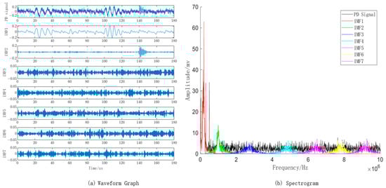 Based on the optimized parameter combination obtained from the WOA algorithm, the VMD algorithm is set with a mode number K of 7 and a quadratic penalty term α of 2807. The waveform and spectrogram of the PD signal with noise decomposed into IMF components by VMD are shown in Figure 7a,b, respectively. From the spectrogram, it is evident that the frequency spectrum of the IMF1 component closely matches the pristine PD signal with noise, and the highest point of the IMF2 component aligns with the PD signal around 1 MHz. This indicates that the parameter combination obtained through the WOA optimization algorithm is reasonable and offers a reliable decomposition of the PD signal with noise using VMD.