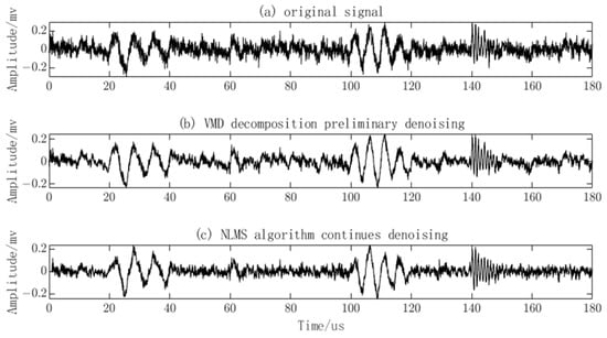 The NLMS algorithm is applied to further denoise the reconstructed signal. The input signal is the PD signal after the preliminary denoising using the VMD algorithm. Due to the periodic nature of narrowband interference signals, they exhibit certain correlations at different time instants. Therefore, a time-division method is used to obtain a reference signal. The PD signal after denoising using the NLMS algorithm is shown in Figure 9. It can be observed that, after the preliminary denoising using the VMD algorithm, the noise has been weakened, but the waveform of the signal still exhibits significant fluctuations, and the PD signal is still submerged in the noise. However, after further denoising using the NLMS algorithm, it is evident that the noise has been effectively attenuated, and the waveform has become smoother. The distinctive features and quantity of the meaningful PD signal are now discernible.