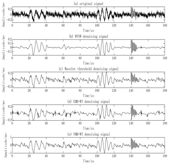 By using the proposed method, the EMD-WT algorithm, VMD-WT algorithm, and Wavelet Threshold algorithm, the measured signals were denoised as shown in Figure 15. It can be observed that the Wavelet Threshold algorithm effectively removes the noise but also eliminates valid PD signals, leaving only one valid PD signal remaining. The EMD-WT algorithm retains valid PD signals but the noise removal is incomplete, resulting in noticeable oscillations. The VMD-WT algorithm achieves a good denoising effect but fails to identify low-amplitude valid PD signals and still exhibits oscillatory behavior. In contrast, the proposed algorithm successfully suppresses noise without significant oscillations and effectively identifies low-amplitude PD signals.