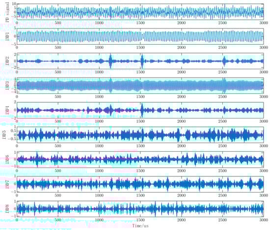 The VMD decomposition of the measured signal, as shown in Figure 14, reveals distinct characteristics. It is evident from the figure that IMF1 and IMF3 exhibit significant periodic oscillations, indicating that these two components are primarily dominated by narrowband interference. IMF2 and IMF4 display three distinct bursts of pulses, suggesting that they are dominated by PD signal components. The remaining components demonstrate random noise characteristics, implying that they are predominantly influenced by white noise. Given the substation’s location in a non-suburban area, surrounded by residential buildings and other structures, combined with the insights from the literature and the decomposition chart, it can be inferred that this measured PD signal is primarily affected by narrowband interference and white noise.