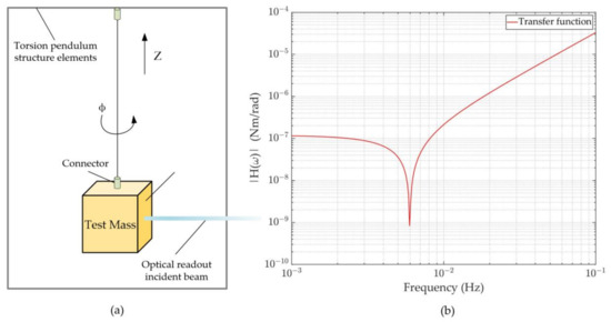 Due to the low torsional stiffness of the suspension wire in the vertical direction (Z-axis), the inertial element of the torsion pendulum is insensitive to all degrees of freedom except the rotational motion around Z. Moreover, the resonant frequency of the inertial element is much higher than the measurement frequency band (mHz), so it can be regarded as a rigid body. Figure 2a illustrates its fundamental features. The equation for the test mass’s motion around Z can thus be expressed as follows: