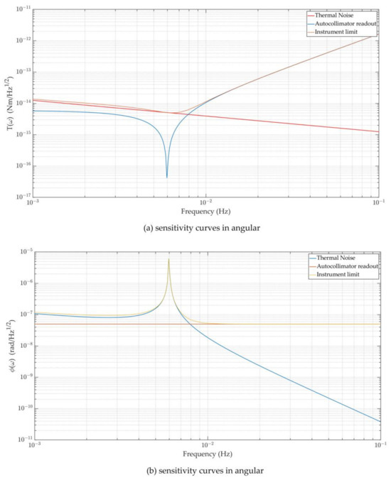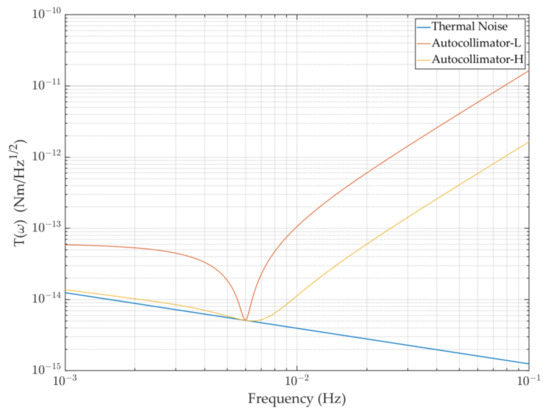 On the basis of the theoretical foundation mentioned above, we characterized the torsion pendulum’s performance level under the influence of thermal noise and autocollimator readout noise, as shown in Figure 3.